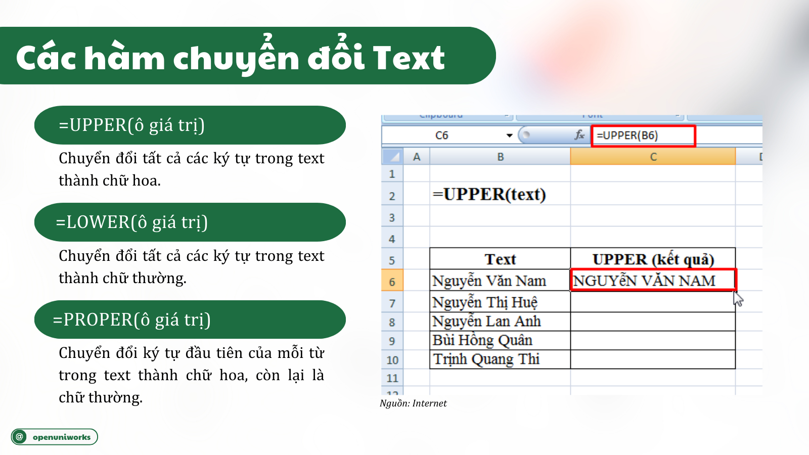 =UPPER(text): Chuyển đổi tất cả các ký tự trong text thành chữ hoa.