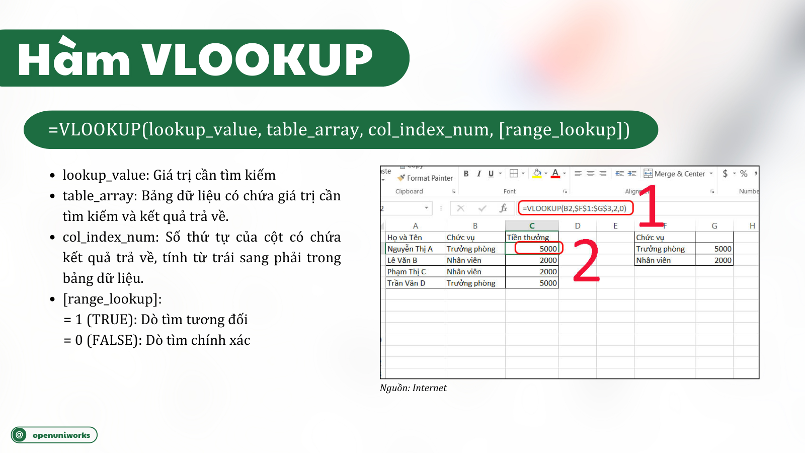 - Hàm VLOOKUP: Là một trong những hàm tra cứu phổ biến nhất trong Excel. Hàm này cho phép bạn tìm kiếm một giá trị trong cột đầu tiên của một bảng dữ liệu và trả về một giá trị từ cùng hàng của cột khác.